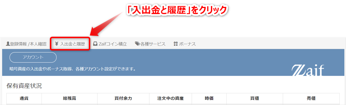 - アカウントページから「入出金と履歴」をクリックします。