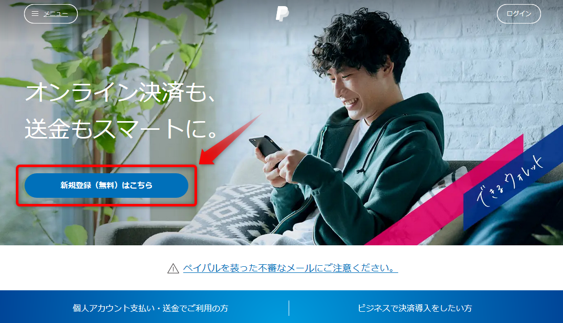 - Paypal のウェブサイトから「新規登録(無料)はこちら」をクリックして始めます。