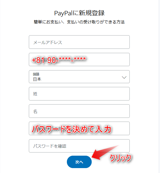 - メールアドレス、携帯電話番号、国籍、氏名のほかにパスワードを決めて入力します。