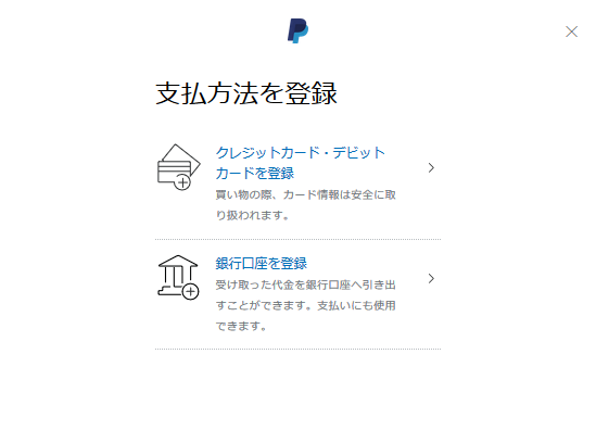 「クレジットカード・デビッドカードを登録」か「銀行口座を登録」を選択します。