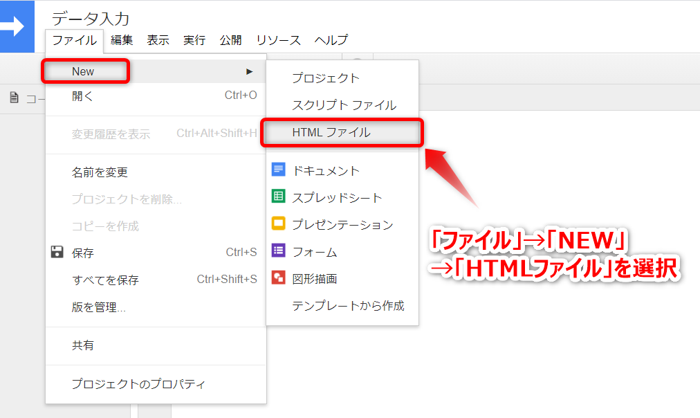 - このプロジェクトに新しいHTMLファイルを作成していきます。スクリプトエディタの上部に表示されているメニューから「ファイル」→「NEW」→「HTMLファイル」を選択します。