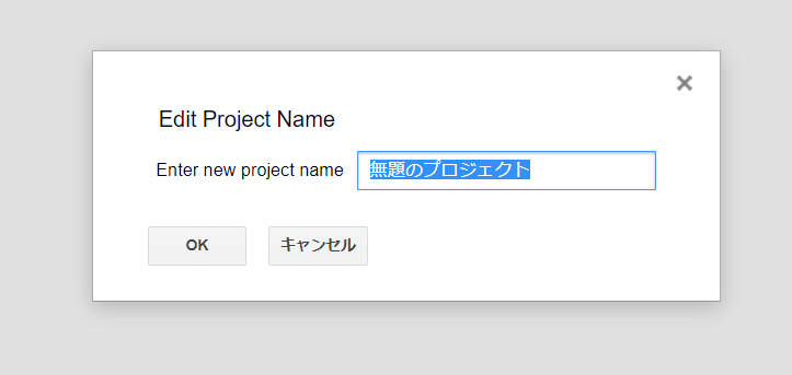 - 起動すると「無題のプロジェクト」が開き、なかには "コード.gs" が用意されています。左上の「無題のプロジェクト」というタイトルをクリックするとプロジェクト名を変更できます。ここでは「データ入力」というプロジェクト名にします。