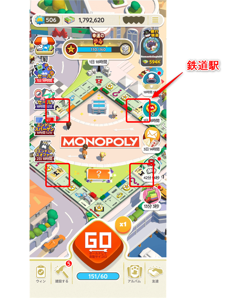 資産を増やすためには、とくにボードに4つある鉄道駅に止まって、解体と銀行強盗で増やすことになります。