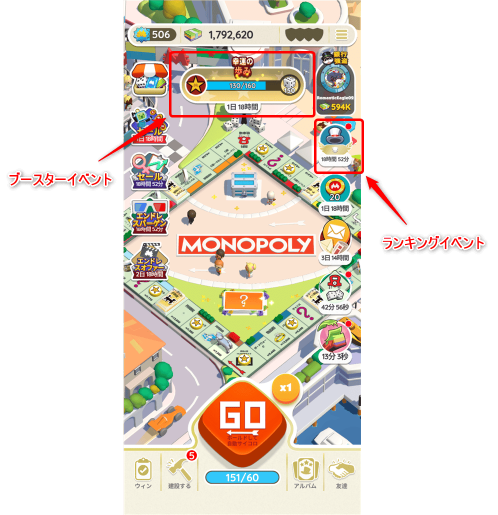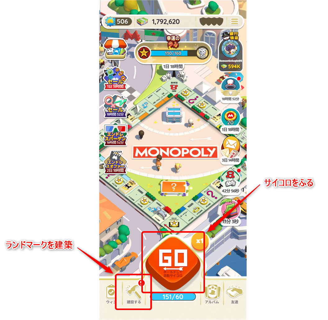 MONOPOLY GOはボードゲームの「モノポリー」をスマホ向けにしたゲームです。プレイ中におもに行うことは、